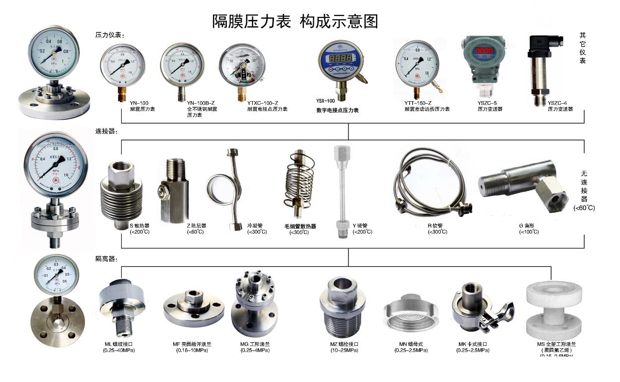 ◆ کاربرد: با توجه به ساختار اندازه گیری غیرمستقیم ، سنج فشار دیافراگم برای اندازه گیری فشار مایعات ، گازها یا مواد جامد جریان دانه ای با ویسکوزیته بالا ، آسان برای تبلور ، خوردگی قوی و درجه حرارت بالا مناسب است. دیافراگم جداسازی مواد مختلفی برای سازگاری با انواع رسانه های خورنده مختلف دارد.